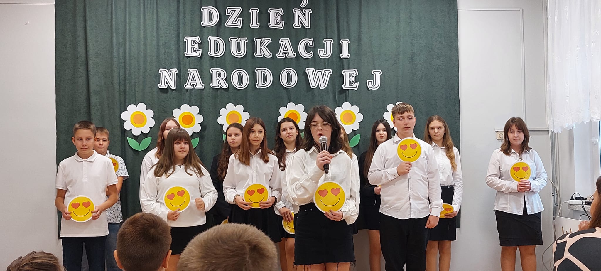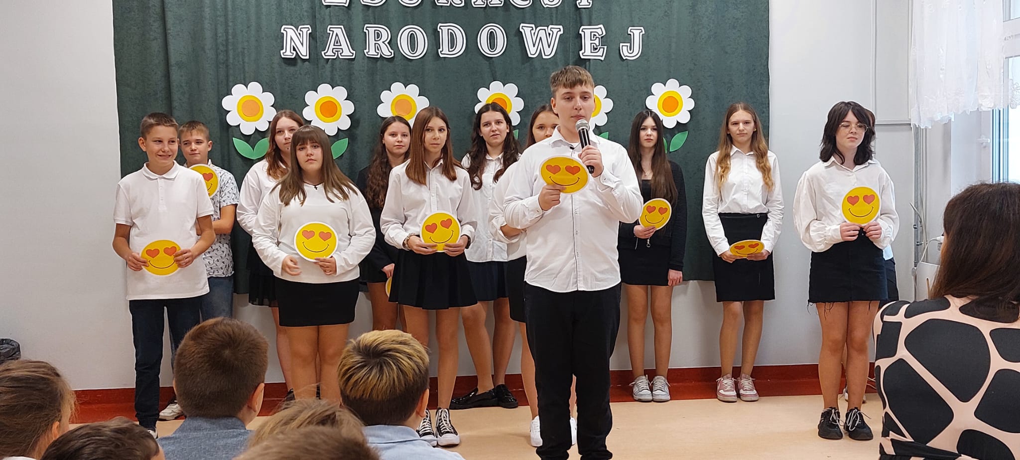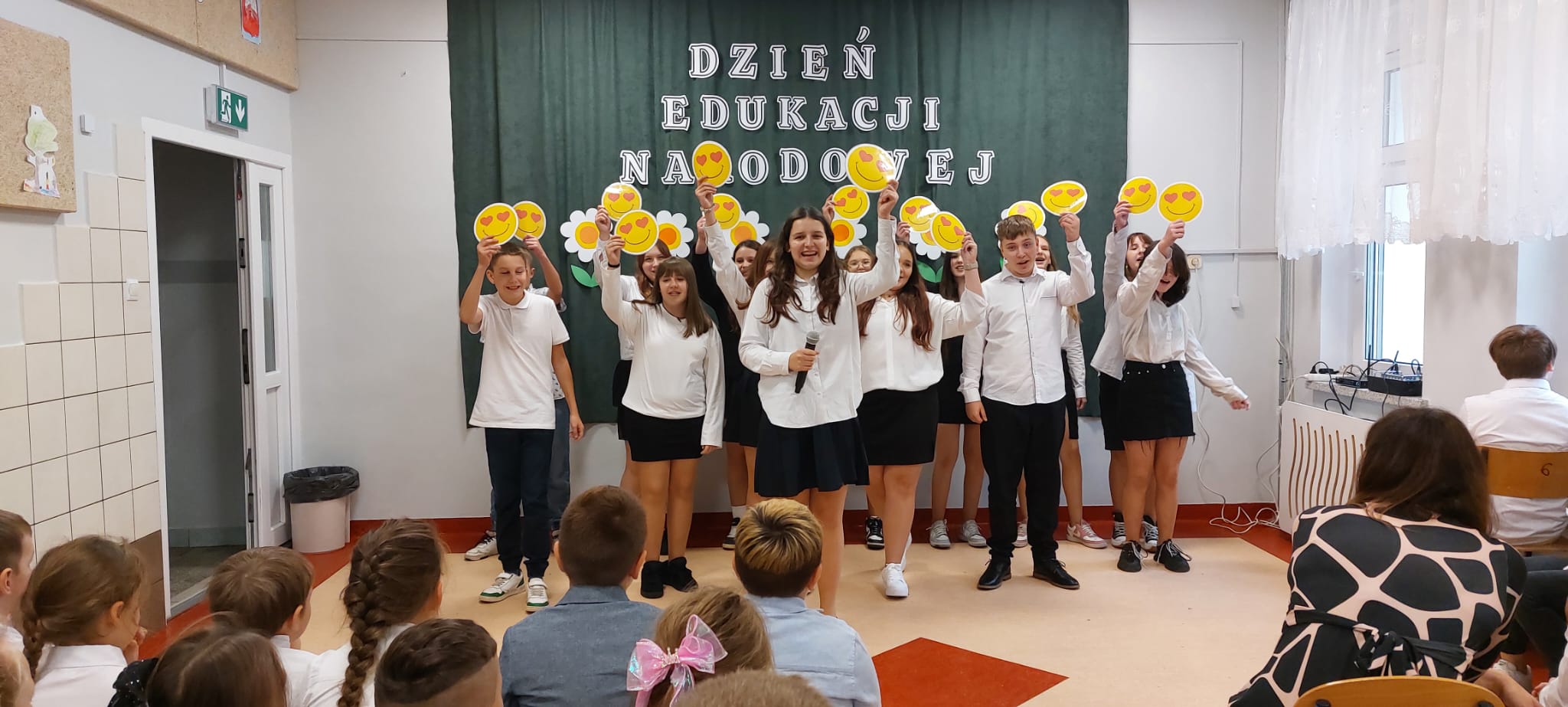 Dzień Edukacji Narodowej w naszej szkole obchodzony był w czwartek 9 października. Przedstawiciele uczniów z klasy VII i VI przygotowali krótkie przedstawienie pt. „Szkoła na wesoło”, którego autorką była p. Maria Stawiarz- przyjaciółka i była nauczycielka naszej szkoły.