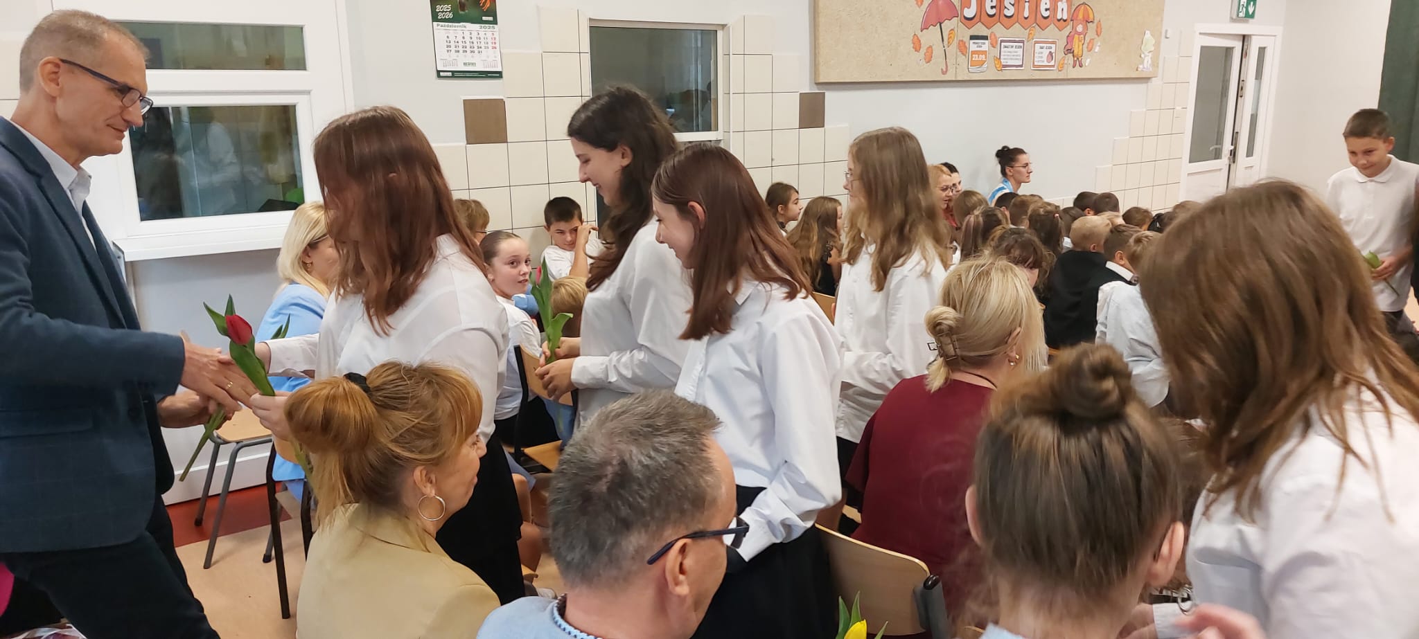 W krótkich i zabawnych wierszykach ukazana została szkolna rzeczywistość „z przymrużeniem oka”. 😉Na koniec dziewczęta z zespołu TREMOLO zaśpiewały wszystkim zebranym piękne życzenia oraz wręczyły kwiaty.🌷 Oczywiście nie zabrakło również życzeń od Rady Rodziców, której przedstawiciele – p. Magdalena Urbaniak i p. Sławomir Geisheimer wręczyli kwiaty wszystkim pracownikom szkoły. Do życzeń dołączył się także nasz Oddział Przedszkolny, z przygotowanymi słodkimi prezencikami. Całe spotkanie upłynęło w niezwykle sympatycznej atmosferze. ☺️