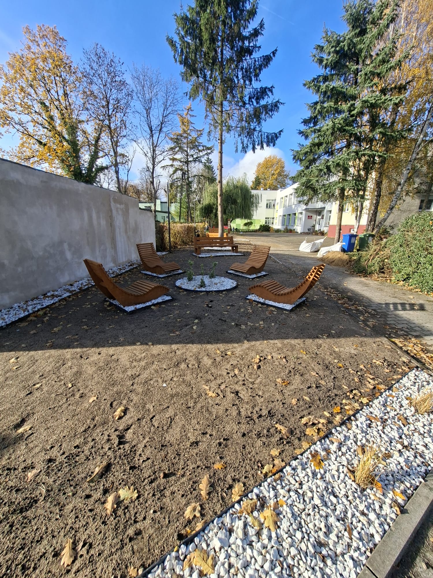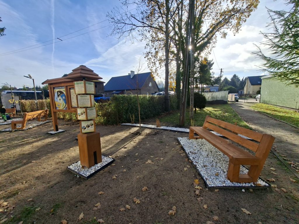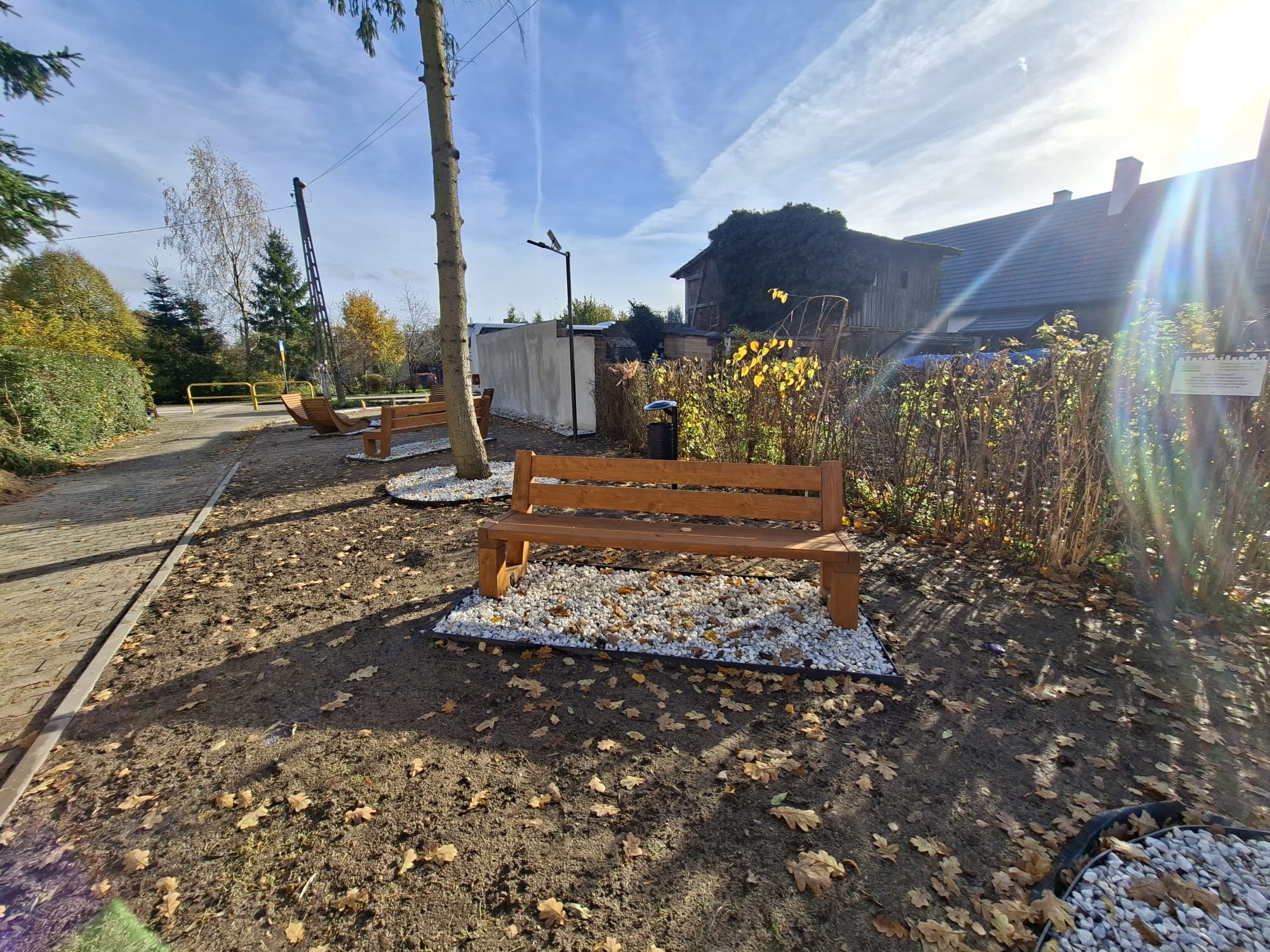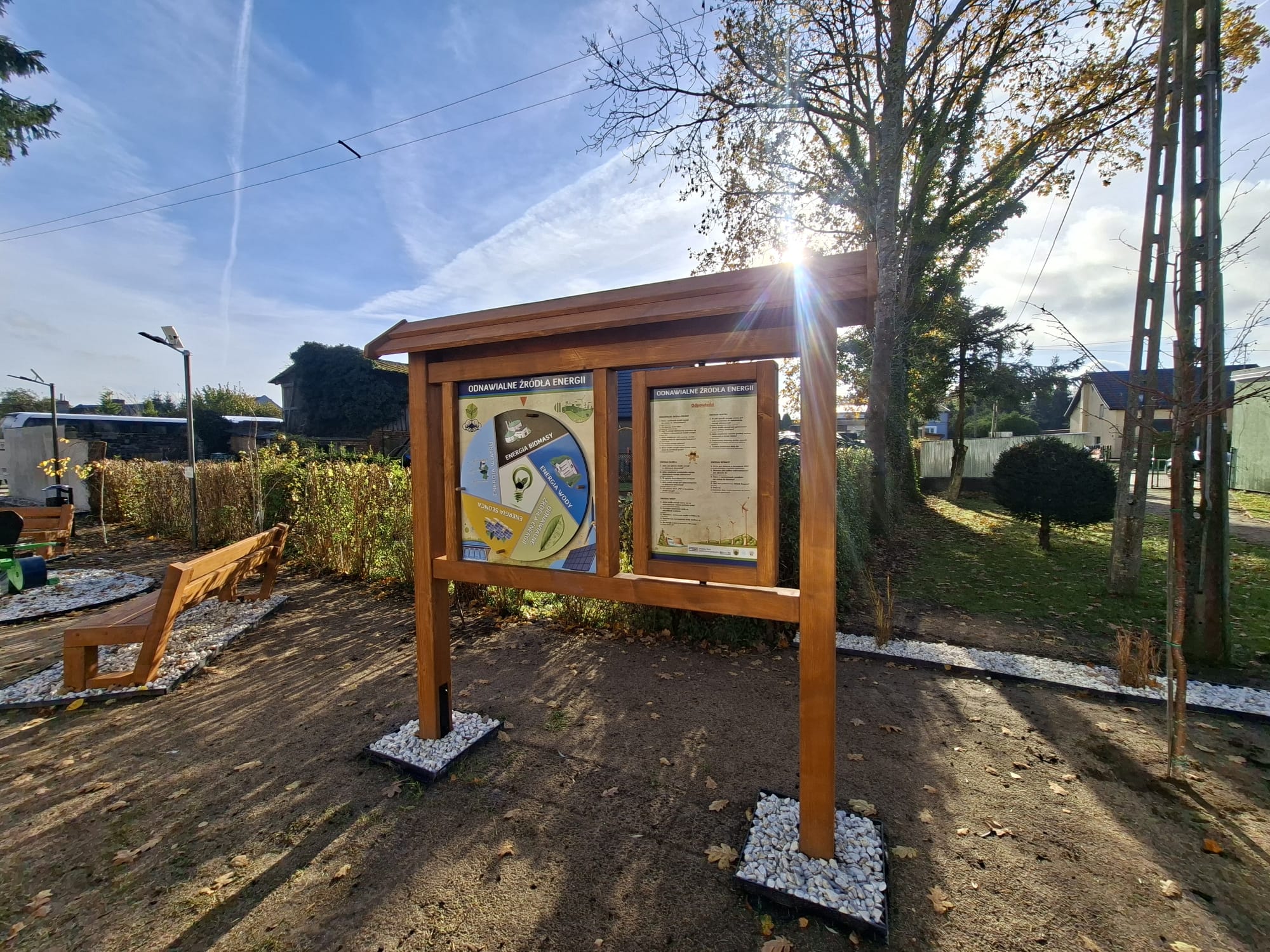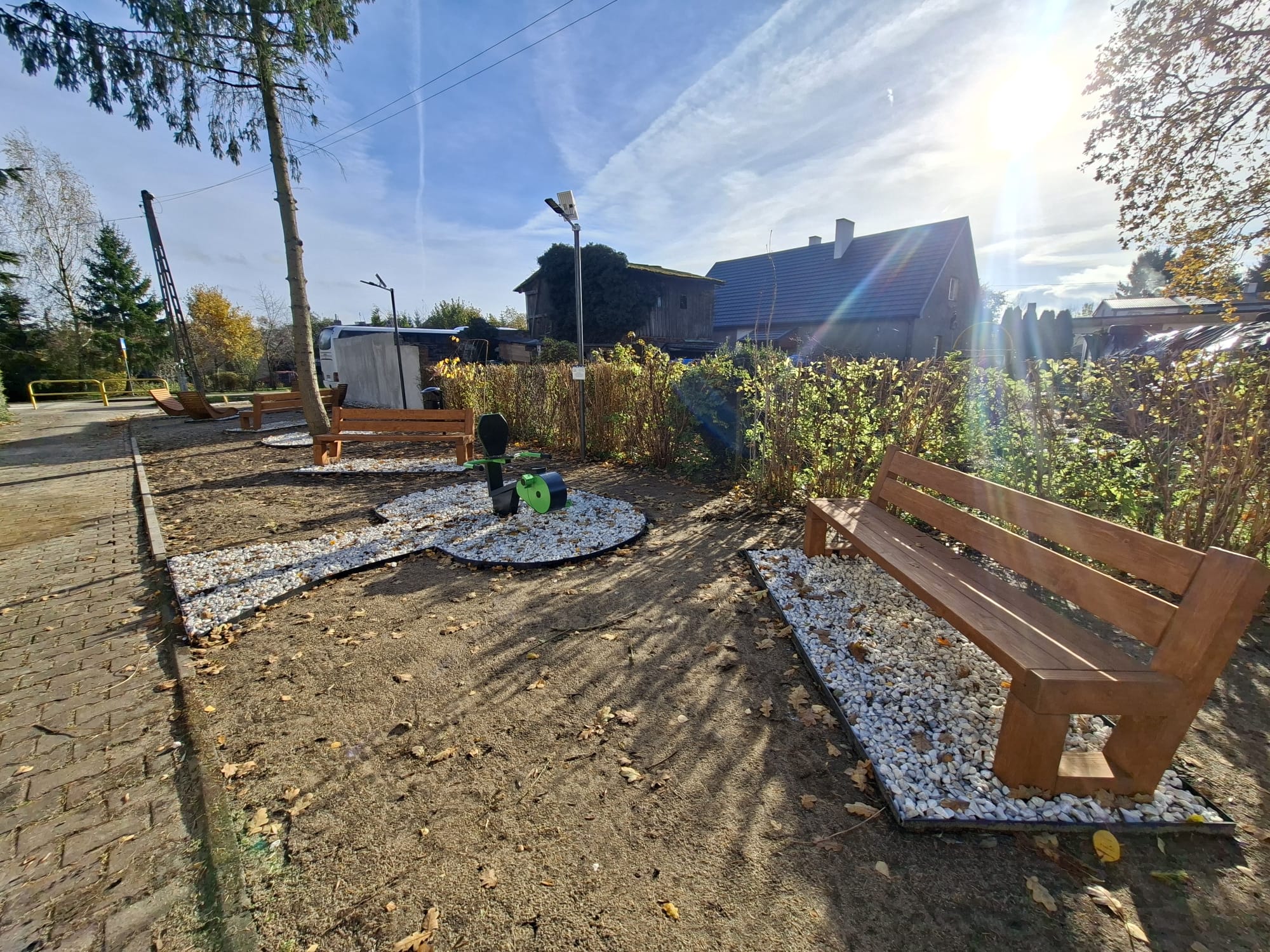 ✅ zainstalowano lampy solarne, ławki, kosz na śmieci oraz gry edukacyjne o OZE,