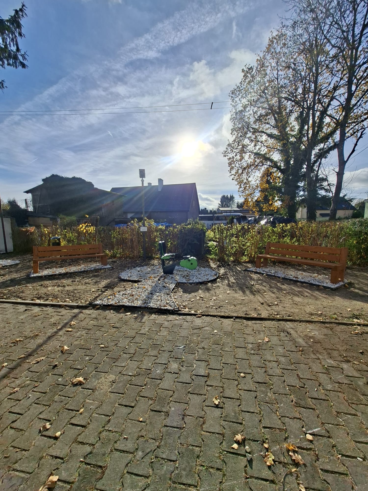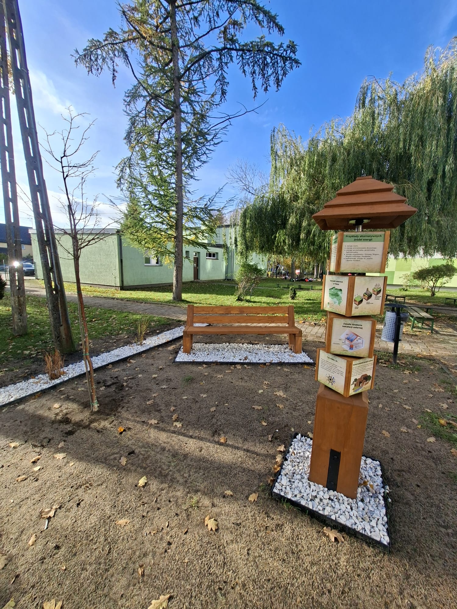 ✅ zainstalowano lampy solarne, ławki, kosz na śmieci oraz gry edukacyjne o OZE,
