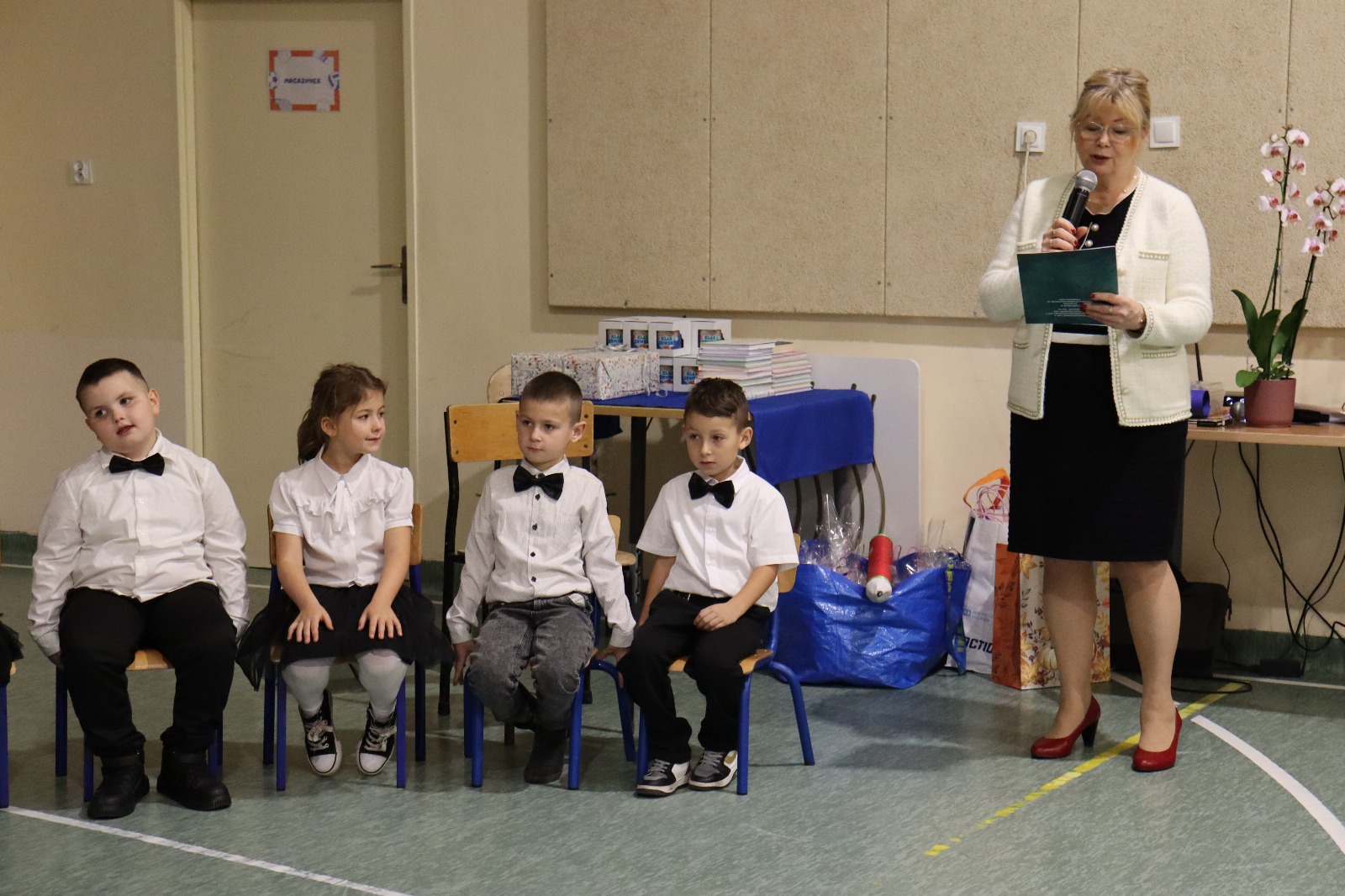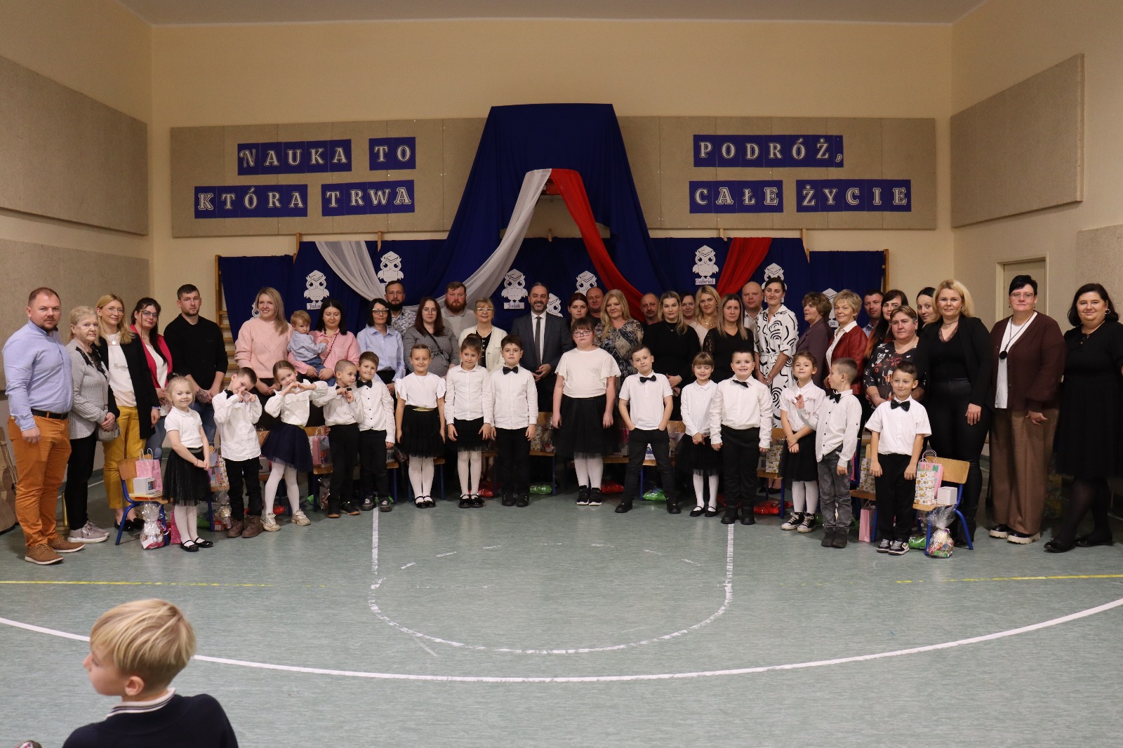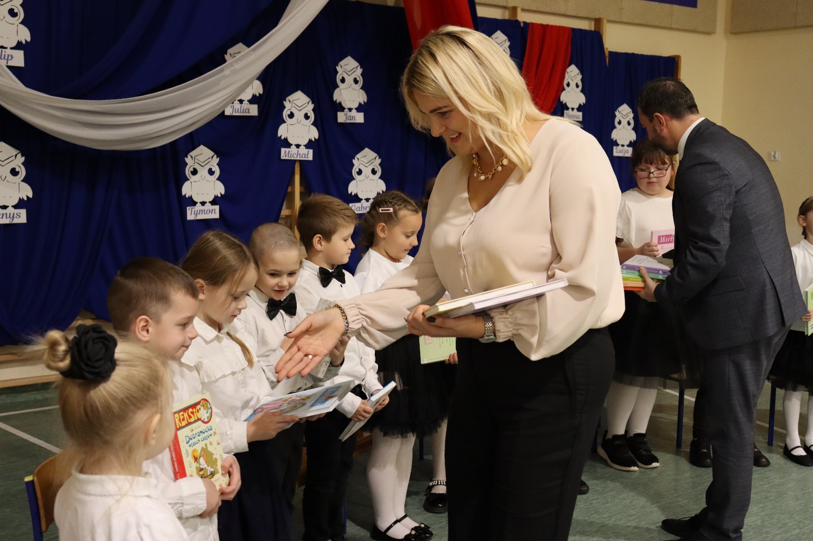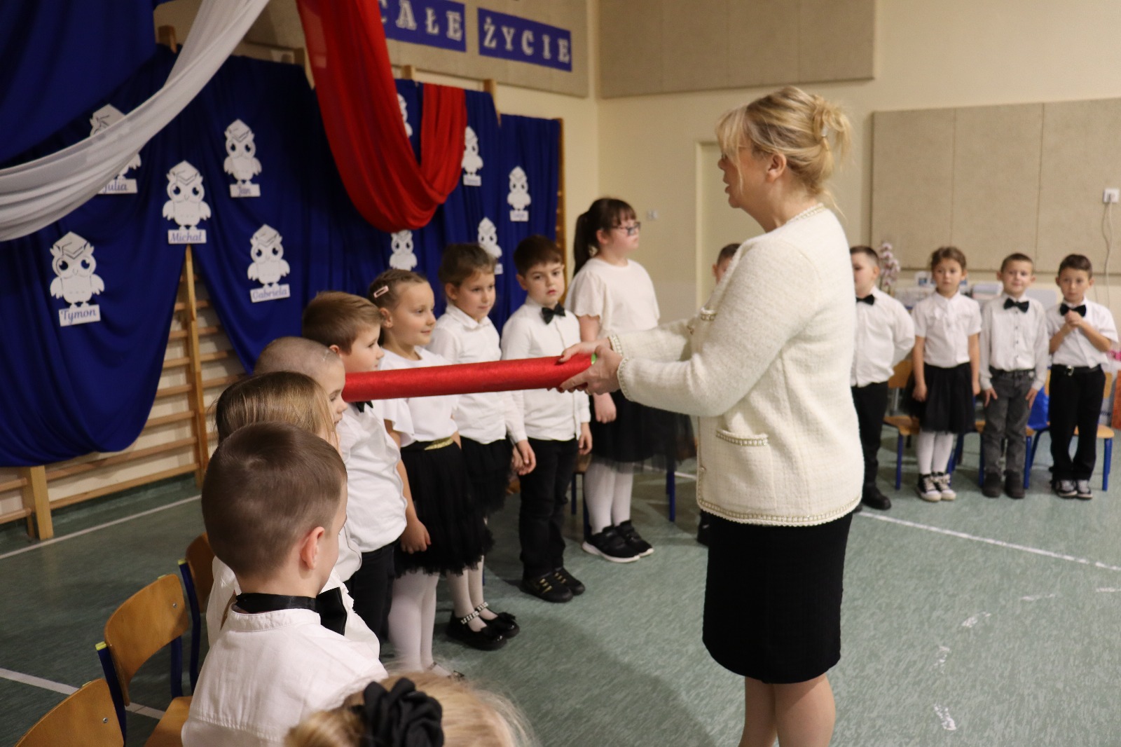 . Przy asyście pocztu sztandarowego odśpiewano hymn państwowy, a następnie Pani Dyrektor- Renata Mankiewicz dokonała aktu pasowania na ucznia