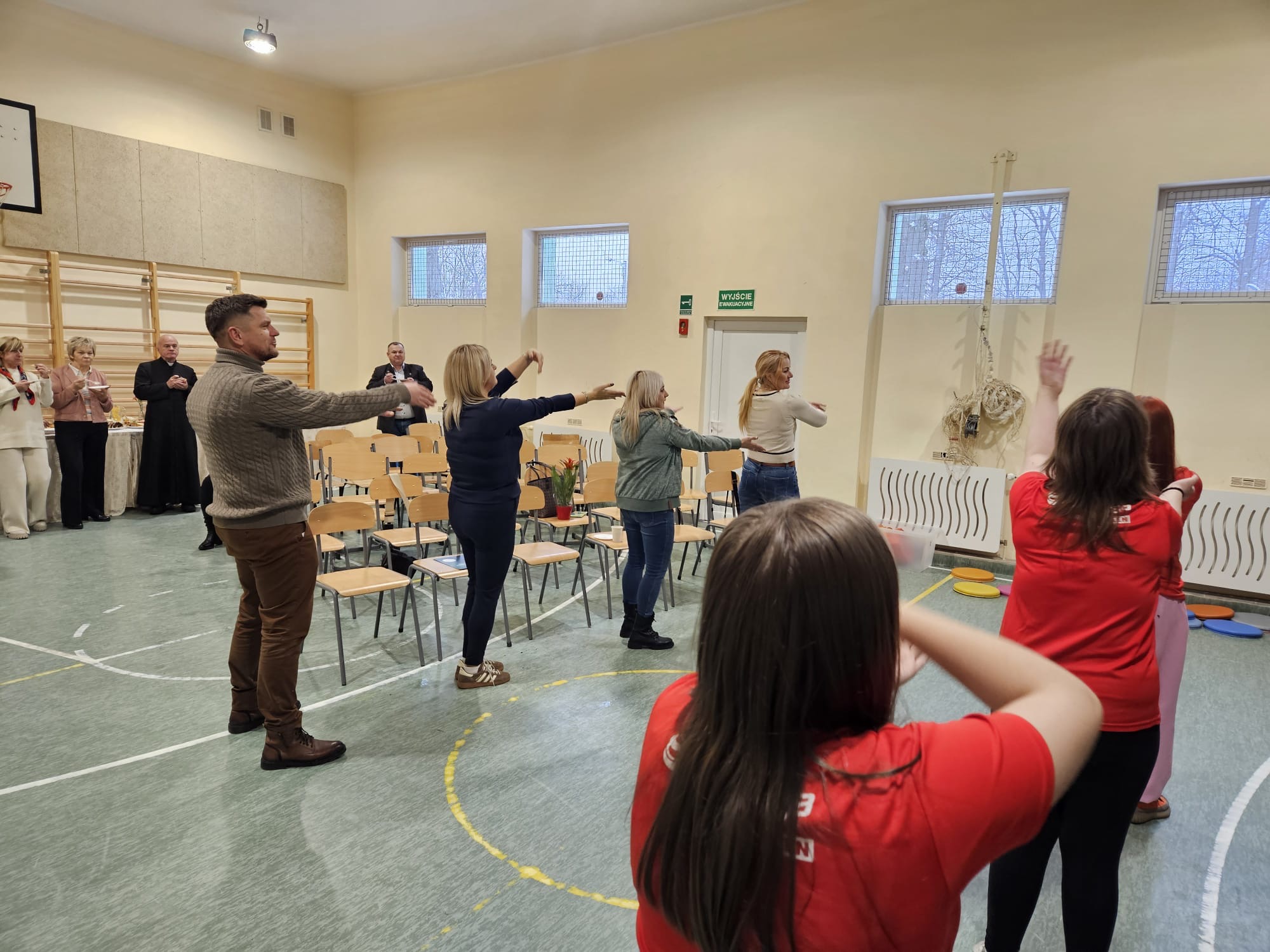 Po części oficjalnej reprezentanci każdej z klas oraz zaproszeni goście przeszli na salę gimnastyczną, gdzie kontynuowano uroczystość. Głos zabrali: Pani Dyrektor, Pani Sekretarz gminy, przybyli na uroczystość Radni rady Gminy w Biesiekierzu oraz przedstawiciele rodziców i uczniów. Na ręce przewodniczącej SU Marceliny Berezowskiej złożone zostały sportowe podarunki, za które serdecznie dziękujemy. Z pewnością posłużą one podczas wspólnych zabaw na nowym boisku. Kolejnym etapem wydarzenia była część sportowa. Uczennice naszej szkoły poprowadziły energiczną rozgrzewkę, po której odbył się taneczny pokaz „Bratnie dusze”. Następnie uczestnicy spotkania wzięli udział w animacjach o sportowej tematyce: układaniu haseł z rozsypanki wyrazowej, Familiadzie, rozpoznawaniu sportowca po zdjęciu z dzieciństwa. Przerywnikami zmagań były wspólne tańce- Makarenna, taniec Country, Belgijka. Miłym akcentem był film przygotowany przez nauczycielkę informatyki panią Konstancję Pawlikowską przedstawiający sukcesy polskich sportowców na przestrzeni ostatnich lat. Uroczystość zakończyła się wspólnym poczęstunkiem przygotowanym przez rodziców, nauczycieli i pracowników szkoły.